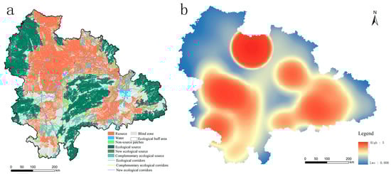 In this study, the reduction of blind zones is carried out only for ecological network based on the following dual considerations: first, based on the kernel density analysis of ecological risk network nodes (Figure 9b), it can be seen that the risk network naturally has low blind zones due to the high spatial agglomeration of the source area and the dependence of the diffusion path on linear infrastructure [48]; second, after spatial superposition of ecological and risk networks, in the ecological risk patterns (Figure 9a), the area of integrated blind zones in the study area is greatly compressed compared with the single ecological network, and the residual blind zones are fragmented and small in size, and have a weak impact on the overall pattern.