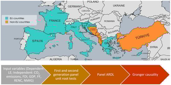 The input data (1990–2023) were collected from the World Bank and Our World in Data websites. The following econometric analyses are performed on the selected EU and non-EU Mediterranean countries (as in Figure 1): first- and second-generation panel unit root tests (PURT), panel ARDL, and Granger causality.