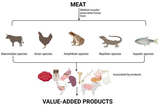 The American Meat Science Association (AMSA) has defined meat as the skeletal muscle and associated tissues derived from mammalian, avian, reptilian, amphibian, and aquatic species commonly harvested for human consumption, including edible offal consisting of organs and non-skeletal muscle tissues [23]; this definition will be employed in this review (Figure 1). The following sections will identify these meat secondary streams from common meat species and highlight some of their current utilizations.