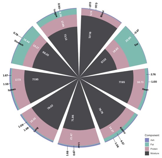 By-products from mammalian animals refer to all parts of live animals that are not part of the dressed carcass [24]. They include all non-skeletal muscle components arising from meat processing and fabrication [17] which, when not channeled for human consumption, are mostly sent for rendering, incineration, or landfill. According to several reports, about 44–56% bovine, 45–51% ovine, and 30–48% porcine animal live weight represents these secondary streams or by-products [25]. Aside from their enormous volume, these low-value streams are highly nutritious, being especially high in high-biological-value proteins, vitamins, and minerals. As an example, Figure 2 shows the proportion of protein, fat, and ash in various porcine meat by-products.