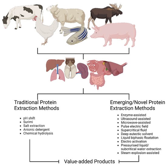 As part of the effort to ensure that our current food system is as efficient as it possibly can be in the face of increasing population growth and climate change, adequate exploration of protein resources of appropriate quality for sustaining human health and population is a relevant line of research. Regardless of the economic and logistical constraints associated with these valorization processes, redirecting proteins derived from food waste back into the human food chain or into animal feed could enhance the efficiency of our global food system [9]. More importantly, although wastes from the meat and protein industry have been reported to contribute the highest negative environmental impact based on estimated greenhouse gas emissions, they ranked only fourth in terms of total weight of waste produced, after fruit, vegetables, and grains [10,11], highlighting the importance of valorizing this waste stream. Hence, protein can be extracted from these secondary streams, especially given their high biological value and overall content. Several methods have been traditionally used for protein extraction and these may vary depending on the type of protein to be extracted, the intended use of the protein, the food matrix, and the solubility of the protein. These methods include acid/alkali extraction, detergent extraction, enzyme-assisted protein extraction, salt extraction, and denaturation or non-denaturation extraction [12,13,14].