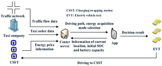 Traffic flow reflects the road congestion degree and directly impacts the driving time to a CSST. The time required for finishing charging and swapping is different [9]. The distributions of taxi orders surrounding different CSSTs influence the potential income derived from these orders. Notably, the absence of taxi orders during the driving time to a CSST and the energy acquisition period implies that the driving process, energy acquisition and the destination directly affect the EVT’s profit. Consequently, the operation profit of an EVT is intricately related and constrained by the interaction among the traffic network, CSST, and EVT. Effective decision making for path planning and EAM selection must consider the interdependent characteristics of the traffic network, CSST, and EVT.