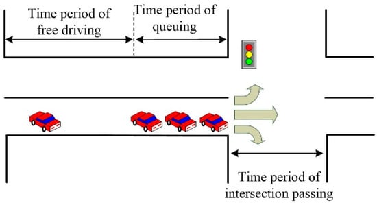 where is the time instant and is the driving time; , and are, respectively, the lengths of time periods of free driving, queueing and intersection passing and are further calculated by Equations (5)–(13).