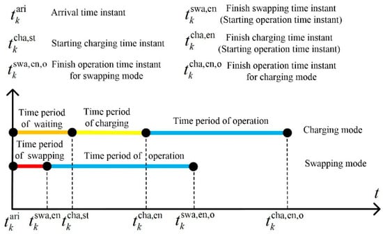 Due to the significantly shorter swapping time compared to the charging time, the swapping mode effectively saves both the charging and waiting time. The saved time can produce more profit for the EVT. For the charging mode, , and are defined as the time periods of waiting, charging and operation in area , respectively. and are defined as the time instants of start charging and the completed operation time instants for the swapping mode. For the swapping mode, and are defined as the time periods of swapping and operation in area , respectively. is defined as the completed operation time instants for the swapping mode.