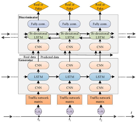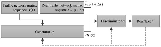 The traffic flow prediction process is shown in Figure 4. The traffic network matrix sequence contains information about traffic speeds on different roads during different time intervals, and this matrix sequence is transmitted to generator . The matrix sequence is predicted and generated based on multiple training with . Then, the generated matrix sequence is identified by discriminator to judge whether or not the generated matrix sequence is a real matrix sequence. predicts the future traffic flow data by learning the probability distribution from a substantial amount of historical traffic flow data.