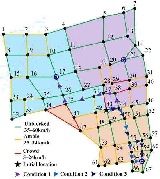 Therefore, the traffic network topology obtained by considering the refined driving time on the basis of a traditional traffic network is given by Equation (14).