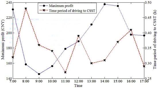 An EVT aims to choose a CSST that promises higher potential operation income. Several studies have investigated the estimation method for operation income. An income estimation method was developed considering passenger behaviors and energy consumptions along a single road [21]. The income estimation was realized considering the variations in taxi orders within one specific area [22,23].