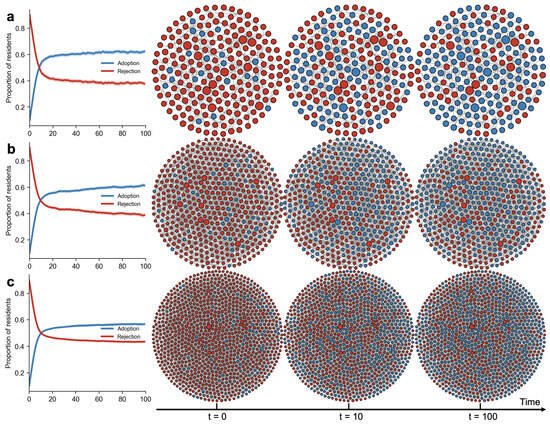 Scenario analysis is a subsequent step in ABM, designed to provide insights into more specific research questions using the proposed model. We first set the initial parameters according to Table 1 and executed simulations in the network with of 200, 500, and 1000 to obtain the average pattern of adopter and rejecter behavioral evolution. This scenario was served as the baseline scenario. The simulation results of the baseline scenario, including the time evolution and spatial evolution of the adoption of sustainable recycling behavior, are shown in Figure 2.