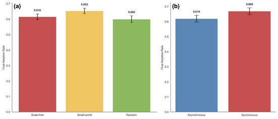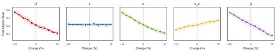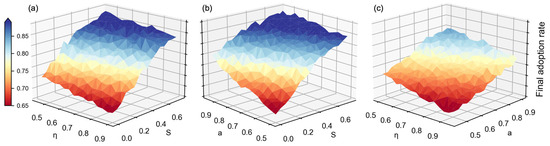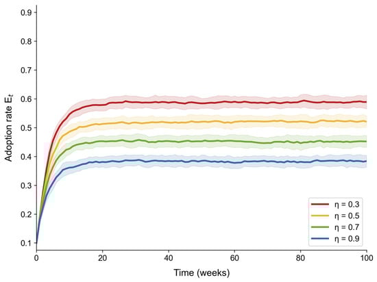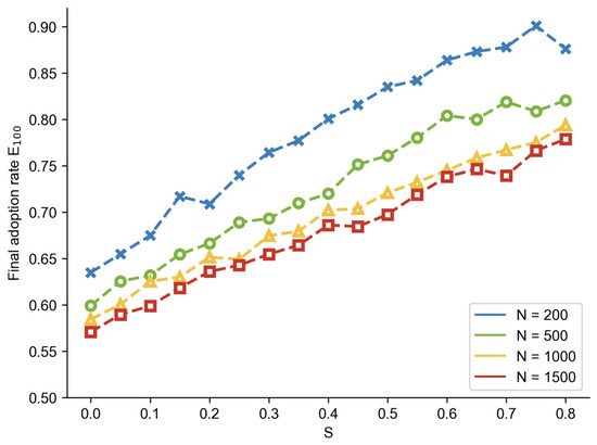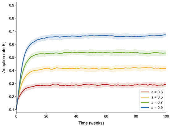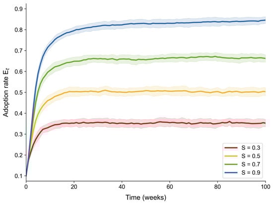 Since this paper focuses on the adoption of sustainable lifestyle at the group level, the adoption rate, , is used to measure the evolution of the adoption strategy at time, . This rate is calculated by the proportion of agents adopting sustainable lifestyle () to all agents in the network, as shown in Equation (14).