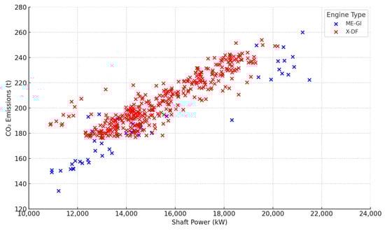 A clear positive correlation is observed between shaft power and CO2 emissions for both engine types, indicating that higher power output is directly associated with increased emissions. However, ME-GI engines generally exhibit lower CO2 emissions at equivalent shaft power levels compared to X-DF engines. This suggests higher thermal efficiency in ME-GI engines, likely attributable to their diesel cycle operation, despite their reliance on pilot fuel with higher carbon intensity.