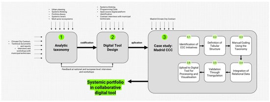 - Phase 3|Madrid CCC case study: The objective of the third phase was to apply the digital tool to the portfolio of projects included in Madrid’s CCC to test its functionality and evaluate its practical utility in a real governance context. The materials used in this phase consisted of the full dataset of projects and initiatives comprising Madrid’s CCC, complemented by feedback and documentation from the municipal staff (Appendix A: List of the projects of the Climate City Contract of Madrid). The process involved loading the CCC portfolio data into the digital tool, configuring it according to the taxonomy, and conducting iterative testing to refine its outputs. Additional feedback was gathered through co-creation and validation sessions with municipal technical staff to assess the tool’s capacity to facilitate coordination, improve information integration, and support decision-making. This process was carried out in six steps.