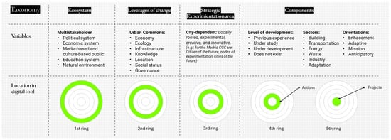 - 2nd ring|Levers of change: This is a framework for designing, monitoring and understanding interventions in complex systems [78,79]. This concept stems from the theory of “leverage points” developed by Donella Meadows, which defines them as places in a complex system where a small change can produce significant changes in the whole [79]. This concept allows for analysis beyond thematic or sectorial lines. In the Cities Mission context, levers of change are the cross-cutting axes of the city needed to trigger profound changes in a multisectoral manner to reduce CO2 emissions. To this end, the Cities Mission integrates technology and infrastructure, governance and policy, social innovation, participation and democracy, financing, and learning as levers for change [80]. While this grouping interweaves different socio-technical axes, its anthropocentric character (human-centred) still dominates the analysis. It is therefore important to integrate more eco-centric approaches (ecosystem-centred) that refocus attention on the many examples of abundance. In this sense, urban commons serve as an analytical framework, a collective resource governance strategy, and an organisational model based on collaboration [81,82], aligning with levers of change. Their relevance has grown amid the climate crisis, revealing the deep link between ecological issues and dominant social structures [82]. In the portfolio approach, the urban commons can be integrated as systemic levers, opening up a broad spectrum of possibilities from an anthropocentric to a complementary eco-centric approach. Hence, the research proposes a binary analysis system characterised by both visions, defining seven systemic levers: economy (monetary and non-monetary), ecology (human-centred and non-human-centred), infrastructures (material and social; technological and natural), knowledge (formal and experiential), location (based on territorial conditions, and based on social conditions), social status (based on the narrative of the upper/cosmopolitan classes, and based on the narrative of the middle and working classes), and governance (top-down, and bottom-up).