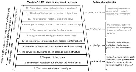Building on Meadows’ insights, while there is no unified definition of what counts as a leverage point, and terms like “levers”, “interventions”, and “drivers” are used inconsistently [33], dialogues on leverage points perspective have expanded rapidly. Abson et al. [17] grouped the twelve points into four system characteristics (parameters, feedback, design, and intent), highlighting a structure from shallow to deep interventions (see Figure 1). They argue that deeper system characteristics constrain the types of interventions that are possible at shallower realms of leverage, and suggest reconnecting people to nature, restructuring institutions, and rethinking knowledge creation and utilisation for more impactful and transformative sustainability interventions, which emphasize the importance of understanding deeper systemic structures and relationships that influence the visible outcomes. Fischer and Riechers [22] assessed the conceptual versatility of leverage points across disciplines, while Birney [34] and Ives et al. [35] explored how specific interventions influence system change. Gaziulusoy et al. [36] merged leverage points with weak signals analysis [37] to frame a design-oriented sustainability agenda and [38] combined leverage points with systems ecology and bionics to propose a new paradigm for transformative sustainability. The implications of adopting a leverage points perspective have also been considered, including how such a framework can help identify system boundaries, actors, connections, and potential interventions (e.g., refs. [38,39,40,41]). Chan et al. [5] propose a framework based on a social–ecological systems lens and argue that Meadows’ typology does not fully address the complexity of global social-ecological systems.