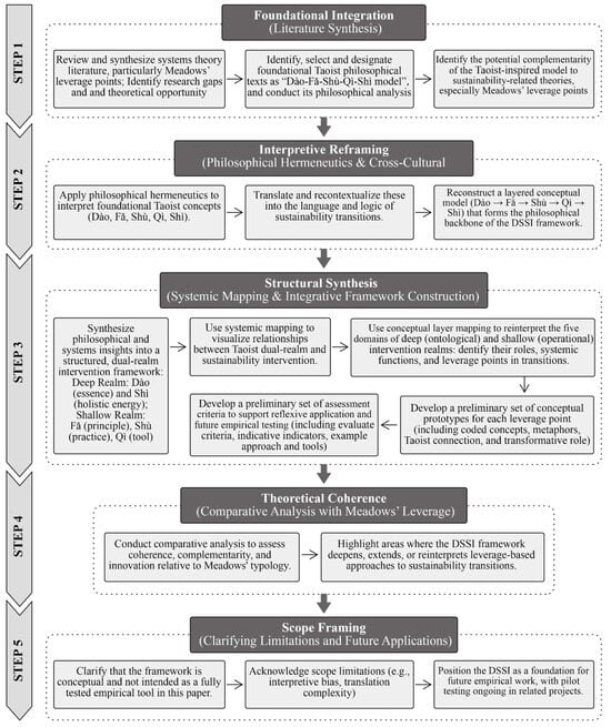 The research unfolds in five interrelated steps (see Figure 2): (1) Foundational integration–literature synthesis, which bridges leverage points theory with a philosophical interpretation of the Dào–Fǎ–Shù–Qì–Shì model, identifying key resonances and divergences between systems theory and Taoist-informed perspectives; (2) interpretive reframing–philosophical hermeneutics and cross-cultural translation, which involves applying philosophical hermeneutics [53] to reinterpret foundational Taoist concepts, translating them into the language of sustainability transitions. This step reconstructs a layered conceptual model that forms the philosophical foundation of the DSSI framework; (3) structural synthesis–systemic mapping and framework construction, which involves employing conceptual synthesis [54] and systemic mapping to articulate the structural logic of the DSSI framework and integrate its multi-level leverage point system; (4) theoretical coherence–comparative analysis with meadows’ leverage points, which refers to aligning the DSSI framework with Meadows’ leverage point typology to establish theoretical coherence and situate the model within established sustainability transition discourse; and (5) scope framing–conceptual boundaries and future applications, which means clarifying the framework’s conceptual boundaries and identifying pathways for empirical exploration, implementation, and further adaptation across diverse contexts. This five-step process integrates multiple knowledge systems, combining cultural pluralism with systems logic. By aligning Taoist philosophy with established leverage points theory, the DSSI framework offers a novel, cross-cultural approach to governance, systemic transformation, and sustainability transitions.