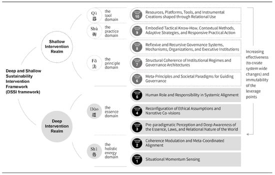To this end, this paper introduces the Deep and Shallow Sustainability Intervention (DSSI) framework, a novel conceptual model that synthesizes insights from Taoist philosophy, specifically the Dào-Fǎ-Shù-Qì-Shì conceptual collection, and complex systems theory, notably Donella Meadows’ leverage points framework [23,24]. The DSSI framework is designed to offer a flexible, adaptive, and context-sensitive structure capable of guiding systemic sustainability transitions across multiple intervention levels and cultural contexts, addressing the lack of integration between ethical–cognitive foundations and operational leverage points in prior approaches. It extends Meadows’ influential leverage point model by introducing a culturally grounded, dual-realm system inspired by Taoist philosophy, thus offering an expanded ontological and normative basis for sustainability interventions.