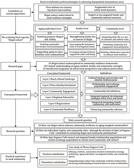 Layers 1–2 support the conditions, Layers 3–4 enact the mechanisms, Layer 5 crystallizes the internal process, and Layer 6 captures the emergent outcomes (Table 1). This conceptual framework highlights three interconnected levels of participation (individual, family, and community) crucial for fostering ikigai-zukuri and community resilience. Grounded in this analytical structure, the present study aims to answer the following (Figure 1): (1) How can ikigai-zukuri enhance community resilience in aging marginal settlements? (2) How do individual, family, and community roles contribute to sustaining ikigai and participation? (3) How does the Engawa Café connect out-migrated families and visitors to sustain rural vitality and culture?