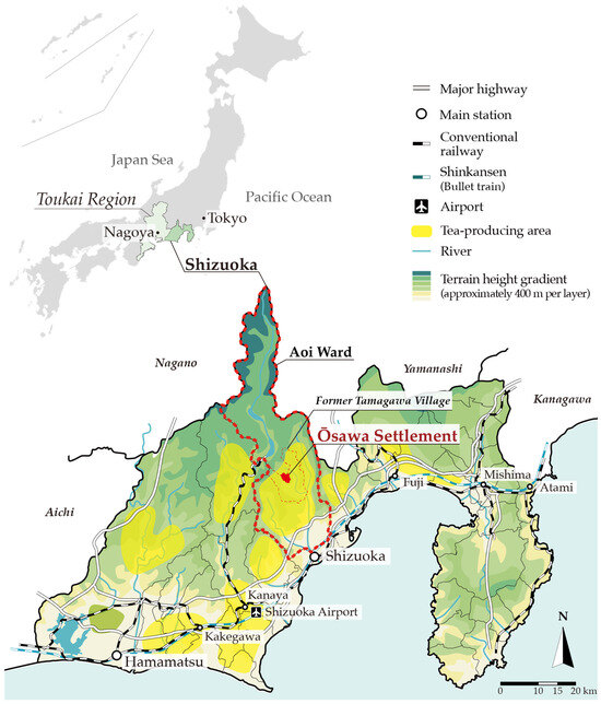 This study was conducted in Ōsawa, a small mountain settlement located in Aoi Ward, Shizuoka City, Shizuoka Prefecture, Japan. Located approximately one hour by car from the city center, Ōsawa is accessible only via winding mountain roads, which underscores its relative remoteness. As shown in Figure 2, Shizuoka Prefecture—situated in the Tōkai Region along the Pacific coast—is widely recognized as one of Japan’s most important tea-producing areas, with cultivation zones spread across diverse geographic settings, particularly in its upland regions.