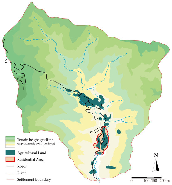 To better understand the spatial context of the Ōsawa settlement, including the distribution of tea fields and overall land-use patterns, a Geographic Information System (GIS)-based analysis was conducted using ArcMap 10.8 (Esri Inc., Redlands, CA, USA). For Figure 3, farmland parcel data published in 2022 by the Ministry of Agriculture, Forestry and Fisheries (MAFF) were used as the base layer [55]. Since this dataset includes all types of agricultural land without distinguishing tea fields, potential tea plots were first identified based on land-use symbols on the Standard Map provided by the Geospatial Information Authority of Japan (GSI; last updated 1 April 2014, accessed via GIS tile server). These candidate plots were then cross-verified using Google Satellite imagery (last modified 6 December 2022), with reference to the 2023 cultivation status. Additional historical imagery was consulted to avoid misclassifying fields undergoing replanting or recent clearing. For Figure 4, the land-use and spatial structure of the Ōsawa settlement were mapped based on GSI’s Standard Map and field observation. Land cover was manually classified into agricultural, residential, and forest zones using satellite imagery interpretation and on-site verification.