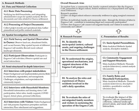 To examine how the Engawa Café project fosters rural revitalization in the context of a depopulated and aging rural settlement, this study adopts a qualitative, locally grounded design combining seven interrelated methods across three categories (Figure 6). First, to understand the socio-spatial context and local cultural assets, we conducted: basic data processing, field surveys and spatial observation, and stakeholder interviews regarding the background of the Ōsawa settlement. Second, to investigate the origins and operational structure of the Engawa Café project, we analyzed: project documents and outreach materials, and conducted stakeholder interviews focused on coordination and support mechanisms. Third, to analyze resident roles and everyday experiences, we used: participant observation during café operations, in-depth interviews with household members, and follow-up stakeholder interviews. Fourth, to evaluate the contribution of out-migrated family members and visitors, we conducted: in-depth interviews with household members regarding family roles, and visitor interviews capturing motivations, engagement, and perceived impact.
