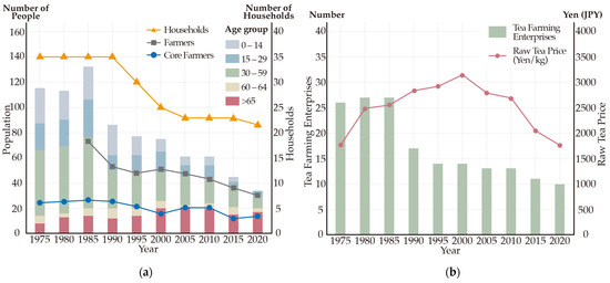 Demographic and agricultural trends in Ōsawa (1975–2020). (a) Population trends showing age group distribution, total farmers, core farmers, and number of households; (b) trends in the number of tea farming enterprises and the raw tea price (JPY/kg). Note: data pertaining to households and farming enterprises from 1975 to 1985 include both subsistence and commercial farm households, whereas data from 1990 onwards solely represent commercial farm households [58]. Household number data were obtained through an interview with the Ōsawa representative (A2).