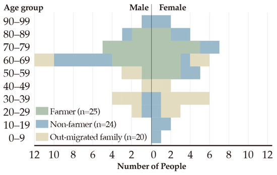 Notably, over half of the residents aged 80–89 continue to engage in agriculture (Figure 8). This aligns with Japan’s world-leading life expectancy [66] and findings that farmers often experience greater longevity than non-farmers [67]. This suggests that although Ōsawa’s current agricultural production relies heavily on farmers aged 60 and over, they may sustain these activities for another 10 to 20 years.