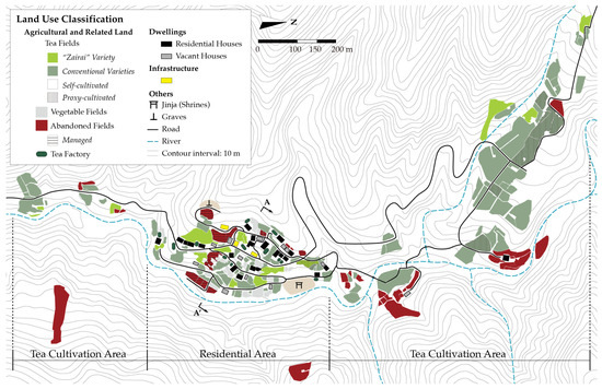Figure 4 illustrates the internal land-use structure of Ōsawa. It reveals a linear settlement pattern along the river valley, with residential areas clustered in the south and surrounded by agricultural land, predominantly tea fields. This stable, tea-centered production model has evolved through close interaction with the natural environment and has shaped a distinctive land-use system and agricultural landscape rooted in both ecological adaptation and everyday rural life.