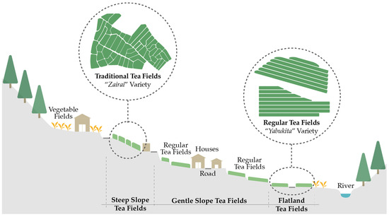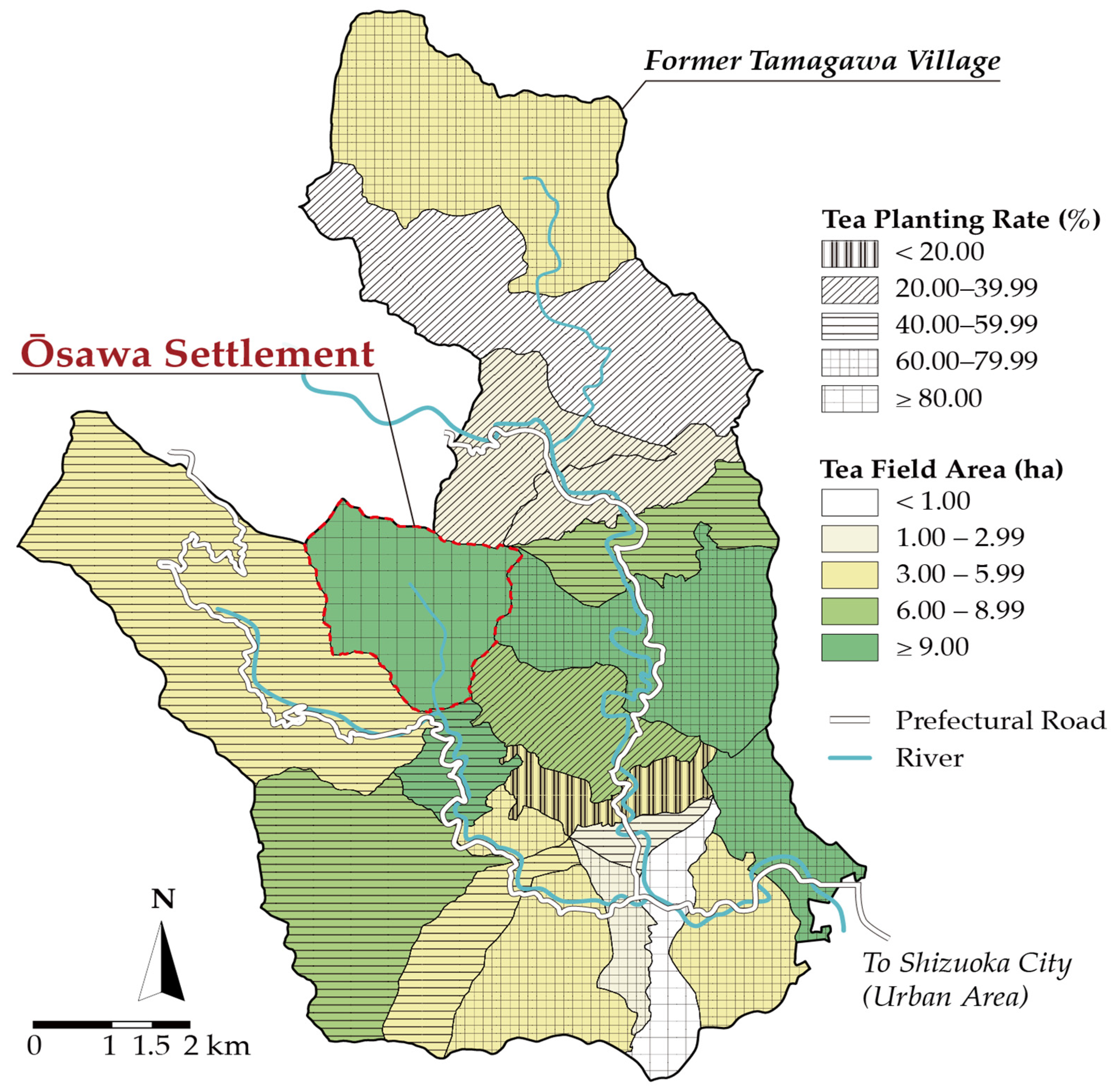 Ōsawa, located on the periphery of the former Tamagawa area, is believed to be the first settlement in the region to begin cultivating tea, with historical records dating back to 1606 [56]. Tea farming has remained the primary livelihood for local residents ever since. As shown in Figure 3, Ōsawa holds a central role in the region’s tea economy, with more than 9 hectares of tea fields and a planting rate exceeding 90%. These indicators reflect not only the scale of production but also the deep integration of tea cultivation into the community’s economy and identity.