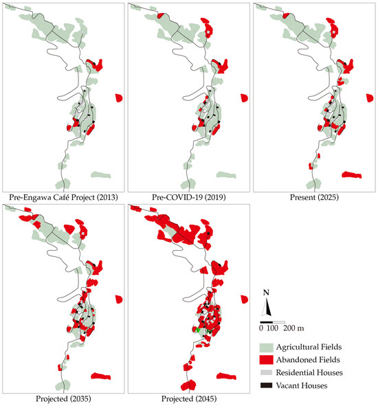 However, reflecting the decline of the tea industry and depopulation, Ōsawa also faces spatial degradation challenges, including abandoned tea fields and an increasing number of vacant houses (Figure 9). Land abandonment has become particularly evident in peripheral areas over the past decade (Figure 11). Even the launch of the Engawa Café has not been sufficient to halt this structural decline, which is primarily driven by aging and the lack of successors. Nevertheless, aided by the long-standing community custom of mutual support (sōgo-fujo) and further motivated by the Engawa Café project, residents actively manage vacant spaces, supplementing regular collective settlement cleaning activities. Some residents who have ceased farming even entrust their tea fields to others for cultivation, receiving a portion of the harvested tea as compensation, demonstrating a non-monetary, trust-based mutual support mechanism (Figure 9).