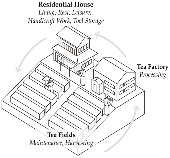 Ōsawa’s livelihood pattern, centered on tea cultivation, reflects a traditional lifestyle in which work, family, and place are deeply interwoven, forming a distinctive cultural landscape [70]. Although declining profitability in the tea industry has led many farmers to shift to part-time farming, the traditional, family-centered practice of self-cultivation and processing remains widespread (Figure 12). During harvest season, tea farmers collaborate with family members—including out-migrated relatives—reinforcing both livelihoods and intergenerational ties. Their ongoing commitment to traditional farming reflects not only a pursuit of quality but also supports the persistence of the traditional Zairai variety. Despite its bitterness and lower market value, Zairai tea is refined through local processing techniques to bring out its unique qualities. These enduring practices embody intergenerational memory, technical knowledge, and a strong sense of place [71], showing how cultural identity and place attachment continue to shape livelihood choices.