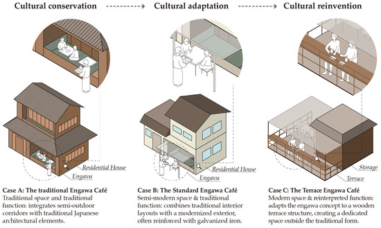 Through the Engawa Café initiative, residents welcome visitors into their engawa, not only sharing their everyday lives in an authentic setting, but also actively sustaining the traditional functions of this spatial element by transforming what was once a private space into a semi-public one. To examine how spatial form intersects with cultural practice in the Engawa Café project, we compare three distinct configurations (Figure 14), each representing a different configuration of architectural structure and cultural continuity: