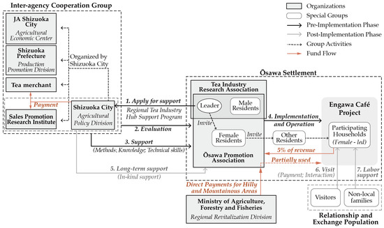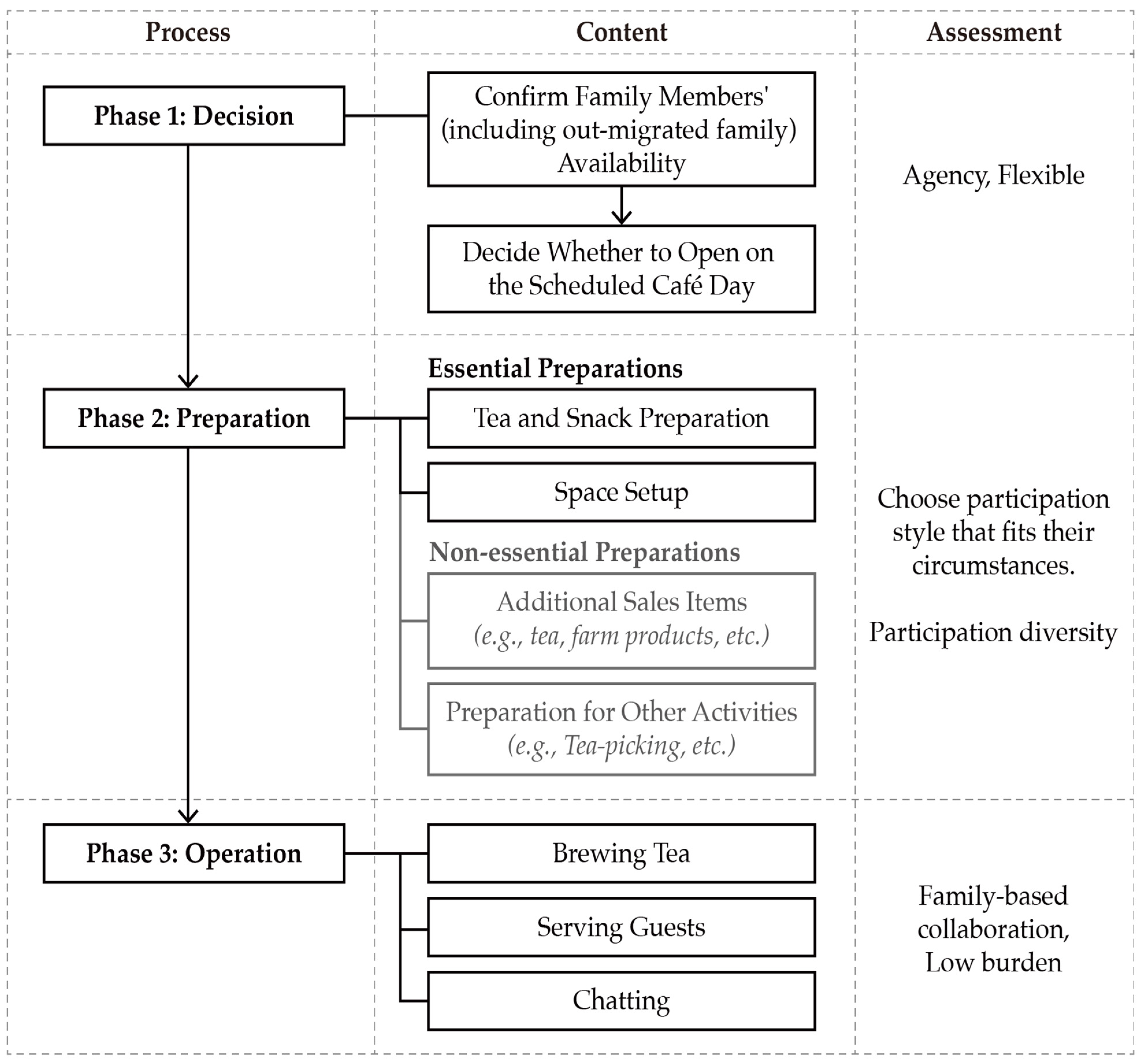 Within this social structure, multiple self-organized groups have emerged. Traditional organizations, such as the neighborhood association (chōnaikai) and women’s association (fujinkai), manage daily affairs, seasonal events, and collective decision-making [60]. In addition, since the 1960s, Ōsawa has maintained a specialized body: the Tea Industry Research Association (TIRA). This association holds annual tea evaluation contests to recognize top-performing tea farmers, fostering a culture of pride and excellence in tea quality. Each tea farmer takes great pride in their tea, and this sense of personal identity has endured even as market profits have declined. It was precisely this deep-rooted pride and sense of collective identity that enabled the association to quickly respond to the decline of the tea industry and become one of the key driving forces behind the Engawa Café initiative.