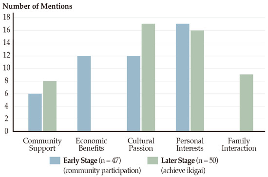 These mechanisms collectively enable the core process of ikigai-zukuri (Layer 5). This central meaning-making occurs as residents reaffirm cultural identity, foster social belonging, and exercise agency, converging everyday cultural practice with social connection and personal validation. This framework thus views community resilience (Layer 6) not just as an external goal but as intrinsically linked to the internal process of ikigai-zukuri [38,52]. The flourishing of ikigai enhances social and cultural dimensions of resilience (e.g., cohesion, continuity). Conversely, a resilient community supports ikigai-zukuri, creating a vital positive feedback loop (Figure 1).