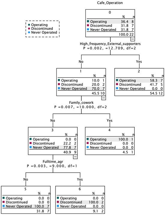 The analysis was based on a total sample of n = 22 households. To enhance the robustness and generalizability of the model, a five-fold cross-validation procedure was applied. The maximum tree depth was set to automatic (up to three levels for CHAID). The minimum number of cases required for parent and child nodes was set to 4 and 1, respectively. The significance level for node splitting and category merging was set at p < 0.01, with Bonferroni adjustment, to mitigate overfitting risks associated with the small sample size [64]. Pearson’s chi-square test was employed as the splitting criterion. This quantitative analysis was conducted primarily to validate and support the qualitative findings, providing additional insights into the household-level determinants of café operational status.