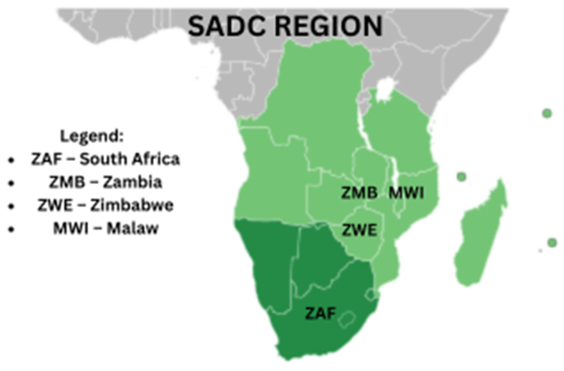 Figure 1 presents the Map of the Southern African Development Community (SADC) region, with the four countries analyzed in this study: South Africa, Zambia, Zimbabwe, and Malawi.