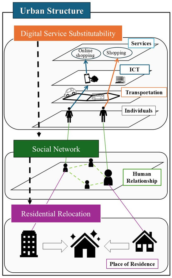 Previous studies [35] have explored changes in online consumption behavior using surveys in Tokyo and Okayama, revealing that the frequency of in-person shopping declined during the pandemic. Findings suggest that women and younger individuals were more likely to engage in online shopping, with motivations differing based on city size. In the Tokyo metropolitan area, time savings were a key factor, while in rural areas, online shopping served as a complement to physical stores. Other researchers [36,37,38] have examined the impact of ICT on transportation behavior, work patterns, and urban structure. Existing studies have also examined the impact of ICT on QOL [39,40], and Mutahari [41] specifically investigated the substitution of physical activities with digital alternatives, focusing on QOL and decarbonization through a policy evaluation framework integrating transportation and ICT networks. However, these studies did not comprehensively explore how digital service substitution influences social networks and urban structure. To fill this gap, this study jointly analyzes digital substitution and social networks in the context of residential location choice. While prior research has provided insights into ICT usage, transportation behavior, and service access substitutability, few studies have addressed the interconnected effects of digital alternatives, social networks, and sustainable urban development.