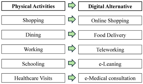 The first section collected demographic information to understand how household characteristics affect access to both physical services and digital services. In this study, we considered 5 basic daily life activities such as shopping, dining, working, schooling, and healthcare visits, as shown in Figure 2. Dining refers to eating outside, such as in restaurants, where individuals use an actual mode of transportation, either walking, cycling, a private car, or public transport, to reach the facility and receive the services. Whereas, food delivery refers to ordering food from a restaurant and eating at a place of residence, where individuals use a mode of ICT to reach the virtual facility and receive the service. Food delivery is a digital alternative to dining in a restaurant. Similarly, online shopping, teleworking, e-learning, and e-medical consultation are digital alternatives for in-store shopping, in-office working, in-school learning, and in-hospital treatment, respectively.