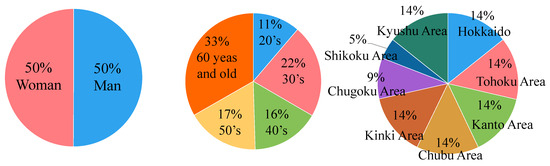 The questionnaire survey was segmented and evenly distributed based on gender, age, and place of residence, based on the population distribution characteristics, as shown in Figure 3. This balanced distribution was carefully considered to improve the quality and reliability of the survey results and remove biases. Although we carefully looked into removing potential biases through survey segmentation, there might have been some bias within the elderly (70s and older) age group, who may not have been capable of using smart devices to answer the online questionnaire survey. However, this bias was insignificant in this study. As one of the objectives of this study, we discussed the future urban structure, where younger individuals are the target, who have enough capability to use smart devices and receive digital services. Therefore, the potential bias with elderly responses cannot be considered a limitation of this study.