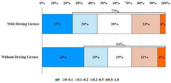Figure 8 illustrates the relationship between license possession and the shopping substitution ratio. Although it was assumed that people without driving licenses might do more frequent online shopping compared to people with driving licenses due to convenience and delivery options, the result of this study shows otherwise. The survey results show that individuals with a driving license tend to do more online shopping. Almost 75% of individuals with a driving license engage in online shopping, whereas only 66% of individuals without a driving license engage in online shopping. However, the substitution ratio of 0.5–1.0 is higher by 2% among individuals without a driving license.