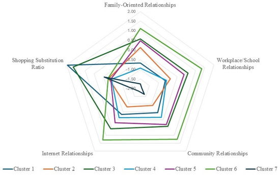Although respondents in Cluster 5 valued social relationships to varying degrees, their shopping behaviors are not strongly influenced by giving importance to social relationships. Their low shopping substitution ratio indicates a preference for physical stores, potentially driven by the direct interaction they have with their environment and the people around them. This cluster may reflect individuals who engage in shopping activities as part of their social experience, valuing face-to-face interactions.