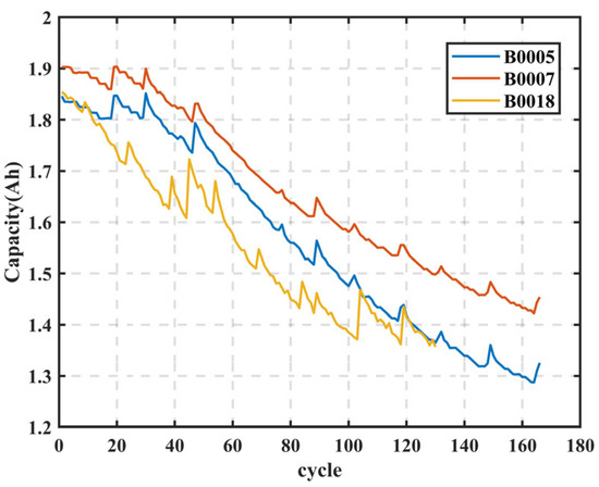 Figure 10a–c, the model accurately fits the SOH variation trends of batteries B0005, B0007, and B0018. In