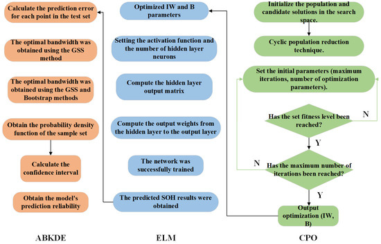 The SOH prediction and uncertainty quantification process based on the CPO-ELM-ABKDE model is shown in