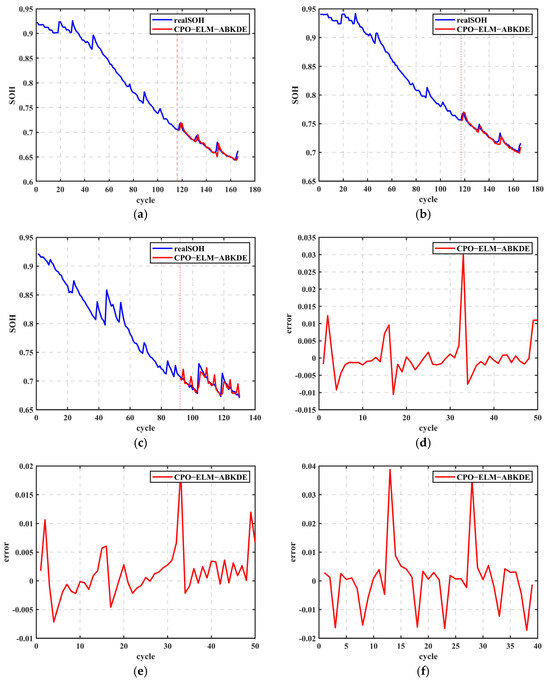 Figure 11d–f show a slight increase in error, but it remains within a reasonable range. This verifies that the CPO-ELM-ABKDE model maintains high prediction accuracy and stability even with a reduced training set. Even with fewer samples, the model can still effectively capture the SOH change trends, providing accurate battery health state predictions through multi-level optimization and adaptive adjustments.
