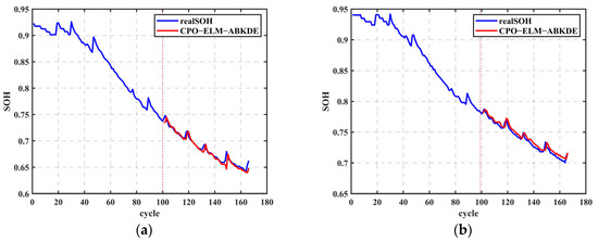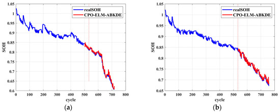 In this study, the SOH of lithium-ion batteries was predicted and analyzed using the CPO-ELM-ABKDE model. First, 70% of the battery data was selected for model training to establish the SOH prediction model. As shown in