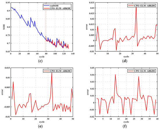 Figure 10f, the error for B0018 is slightly larger but still within the range of −0.02 to 0.04. This indicates that CPO-ELM-ABKDE exhibits good prediction capability and stability. The absence of significant fluctuations in the error further demonstrates the model’s adaptability to different battery degradation modes.