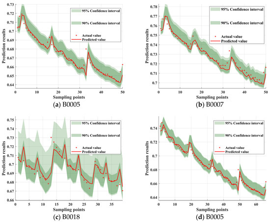 Figure 12, the model’s predicted values closely match the actual values. From the trends in the different subgraphs, it can be observed that the width of the confidence interval is not fixed but varies with the fluctuations in the data. In regions where SOH changes steadily, such as some descending segments of B0005 and B0007, the confidence interval is narrower, indicating stable predictions with low uncertainty. However, in regions with sharp SOH fluctuations, such as local abrupt points in B0018 and B0005, the confidence interval increases significantly, reflecting the model’s adaptability to high-uncertainty data. During the later stages of rapid SOH decline, the prediction interval width slightly increases, indicating that the model may face higher uncertainty at low SOH levels. This adaptive adjustment characteristic of the interval shows that CPO-ELM-ABKDE, combined with uncertainty quantification, can dynamically adjust the prediction interval based on data features, improving the model’s robustness and reliability.