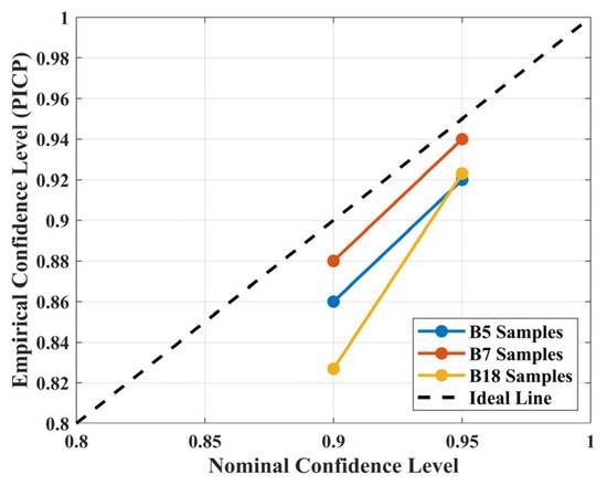 Figure 13. It can be observed from the figure that all three datasets closely follow the ideal line in terms of overall trend. Under the 95% confidence interval, the empirical coverage rates for B0005, B0007, and B0018 were 92%, 93.5%, and 91.6%, respectively. Under the 90% confidence interval, the empirical coverage rates were 86%, 88%, and 85% for B0005, B0007, and B0018, respectively. These results are highly consistent with the nominal confidence levels. This indicates that the constructed “90%” and “95%” confidence intervals are indeed capable of covering the actual SOH values at rates close to the expected levels in the experiments, demonstrating good statistical interpretability. These results further validate the accuracy and reliability of the CPO-ELM-ABKDE model in uncertainty modeling, showing that ABKDE not only adapts to local fluctuations but also maintains consistency in actual confidence levels, thereby offering strong practical value in battery SOH prediction tasks. Based on the results in