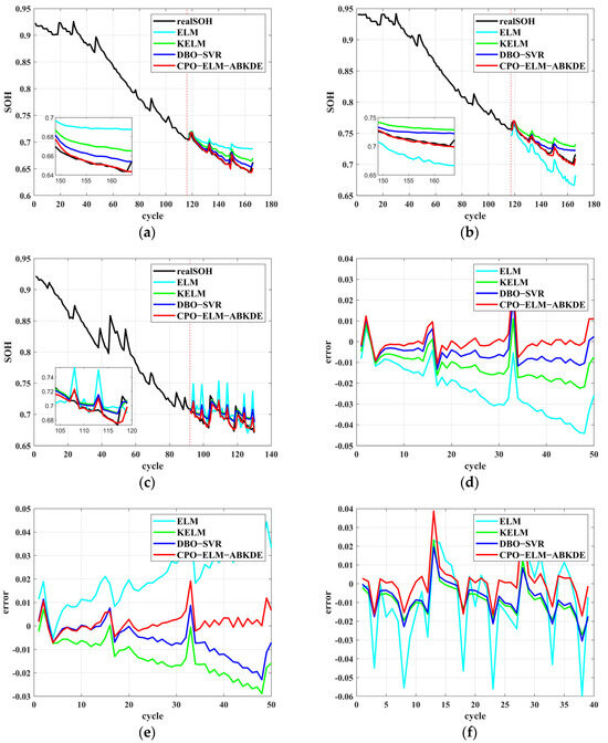 By analyzing the SOH curves, the advantages of the CPO-ELM-ABKDE model become clear. In contrast, the ELM, KELM, and DBO-SVR models exhibit larger prediction errors, with overall prediction values being higher than the actual SOH, resulting in less-accurate predictions. The error curves shown in panels (d–f) further confirm the advantages of the CPO-ELM-ABKDE model. As seen, the errors in CPO-ELM-ABKDE remain within a smaller range, with smoother fluctuations and smaller amplitudes compared with ELM and DBO-SVR, demonstrating its good stability. Particularly during the later stages of battery degradation, the error in CPO-ELM-ABKDE is significantly smaller than those in the other models, indicating its strong generalization capability across different life stages. Overall, the CPO-ELM-ABKDE model, by integrating adaptive kernel density estimation and swarm intelligence algorithms, greatly enhances prediction accuracy, stability, and robustness, providing a more reliable and efficient solution for battery SOH prediction.