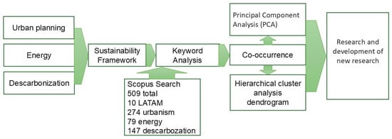 Current urban planning, energy, and decarbonization needs pose significant global challenges, which vary dynamically between regions. Therefore, this article proposes a methodology combining a systematic literature review with a multivariate bibliometric analysis, focusing on the intersection of keywords. From a search of research articles in the Scopus database (2020–2024), 509 articles were selected using criteria based on the simultaneous presence of keywords in titles and descriptors. Subsequently, co-occurrence analysis techniques were applied using VOSviewer software, and an exploratory multivariate analysis was developed using Principal Component Analysis (PCA) and Hierarchical Clustering (HCC) to identify thematic patterns, conceptual gaps, and relationships between domains. This methodology allowed for the construction of a replicable model that systematizes scientific trends and guides future research on urban sustainability with a Latin American focus. This is illustrated in Figure 1 using a methodological flowchart.