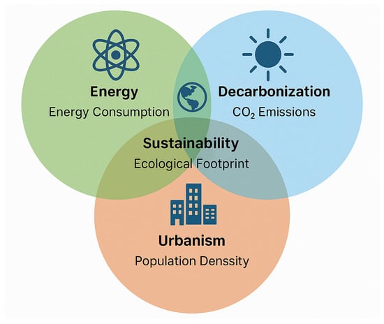 In Figure 2, a Venn model is shown, representing thematic integration where sustainability is defined as the convergence between urban planning, energy, and decarbonization, with the ecological footprint being the central indicator reflecting their comprehensive interaction [8,9]. In this way, sustainability emerges as the point of convergence of these three axes, highlighting the importance of balanced strategies that optimize resources, reduce environmental impacts, and promote resilient urban environments [10,11,12]. This study is framed within an approach oriented toward the technical analysis of the relationship between urban planning, energy, and decarbonization in the context of sustainability. Its main objective is to identify research opportunities in these areas, based on the thematic and methodological analysis of recent scientific production. While the relevance of complementary dimensions such as environmental and energy law, public policy, administration, and economics is recognized, these are beyond the scope of this work. However, they are proposed as future lines of research that could be integrated to strengthen a more holistic vision of sustainability in Latin America.