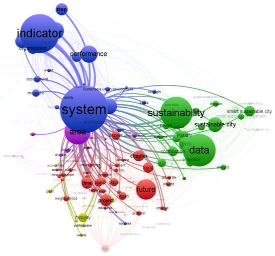 - Blue cluster (Technological/Methodological): Includes terms such as system, indicator, performance, and organization, reflecting a technical approach focused on the measurement, modeling, and evaluation of urban and energy systems [9,16,39].
